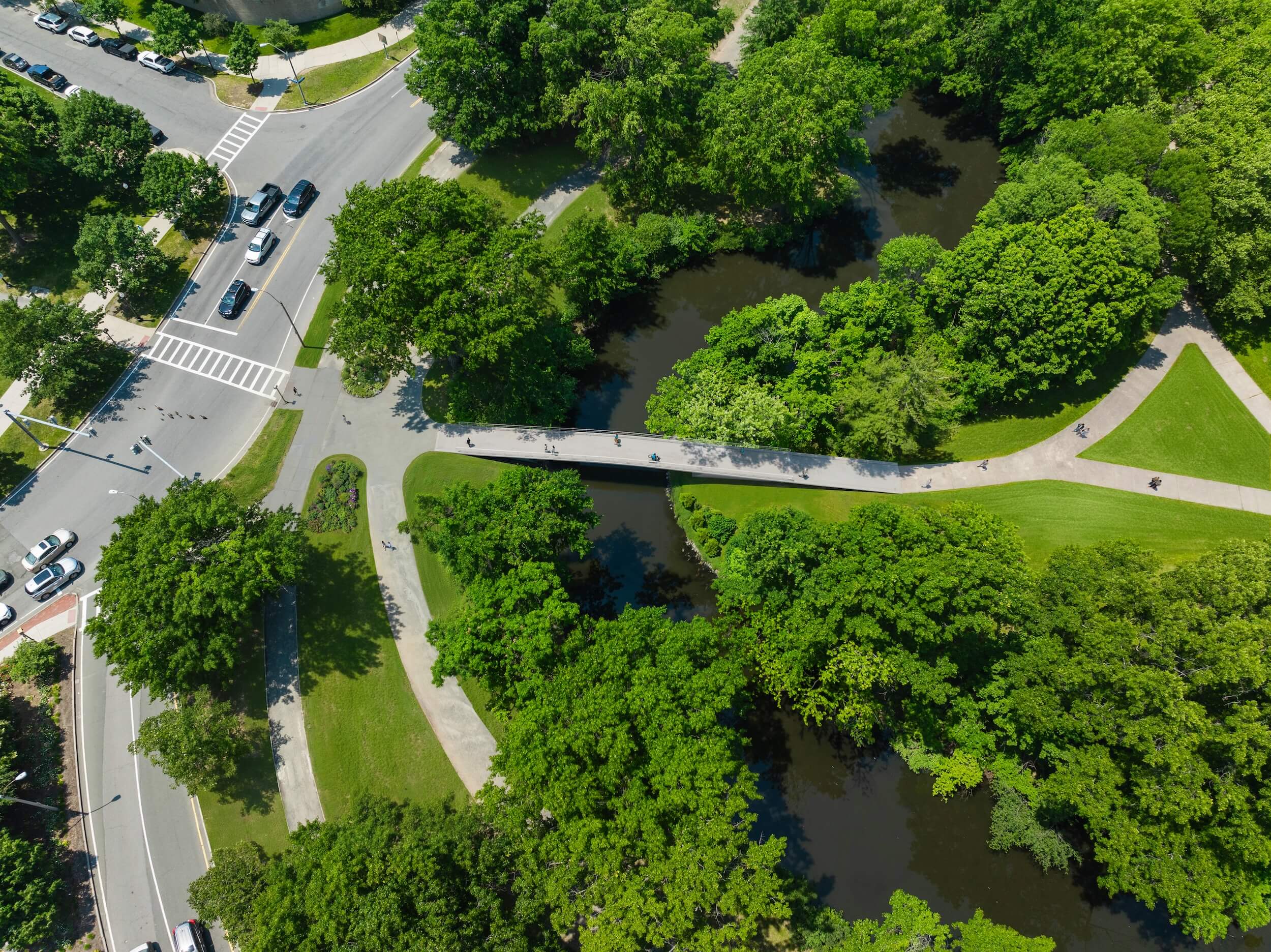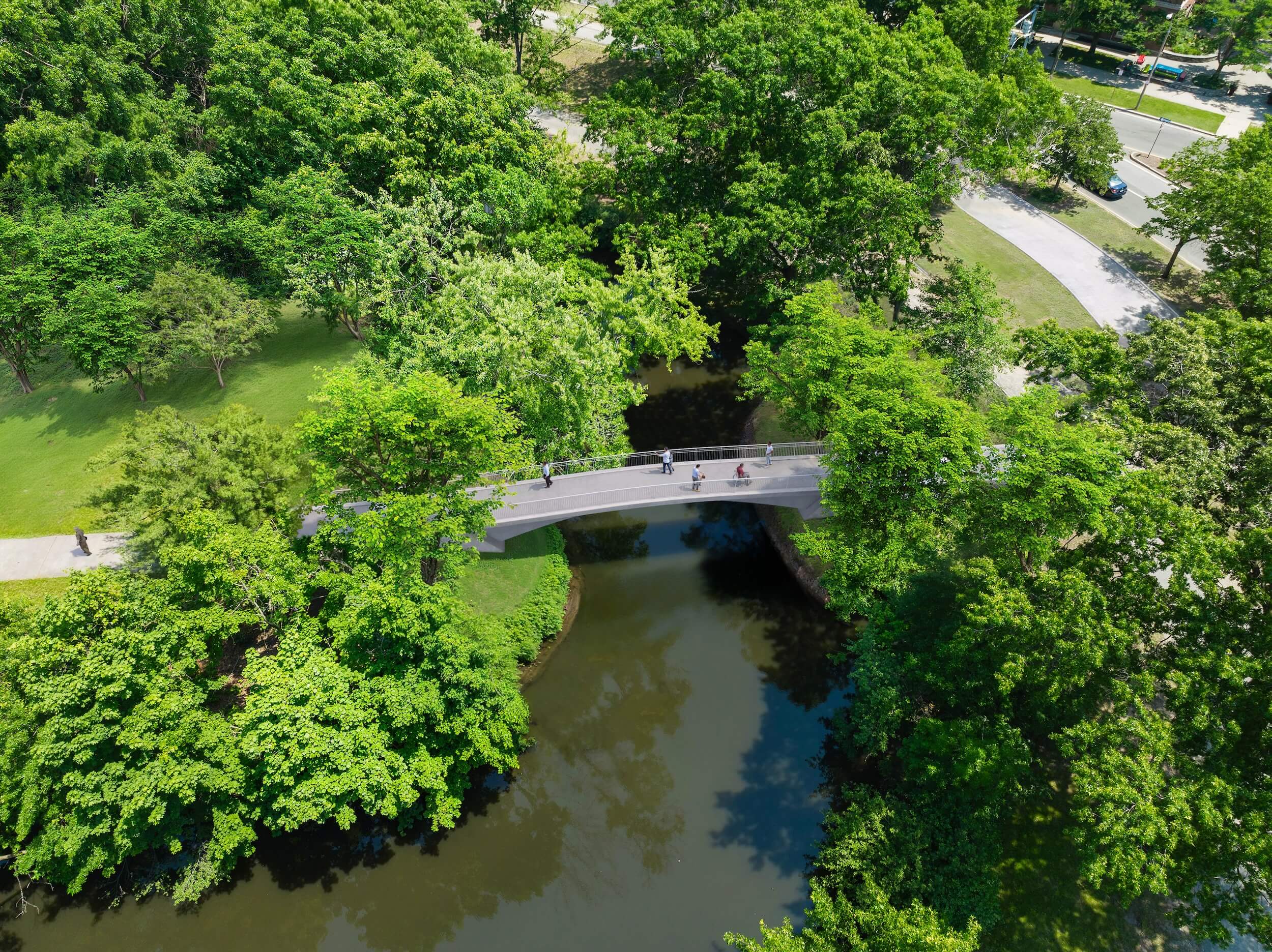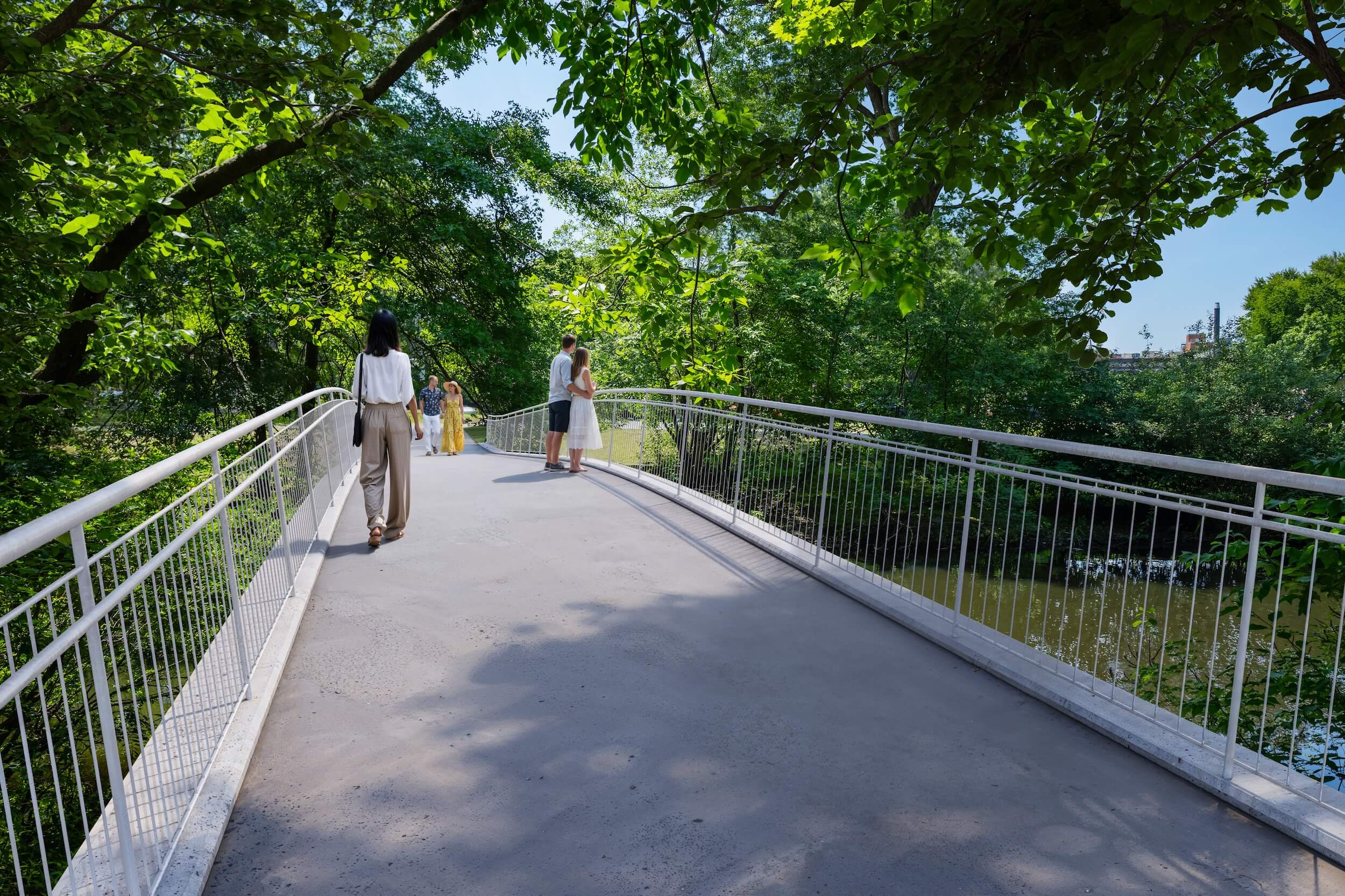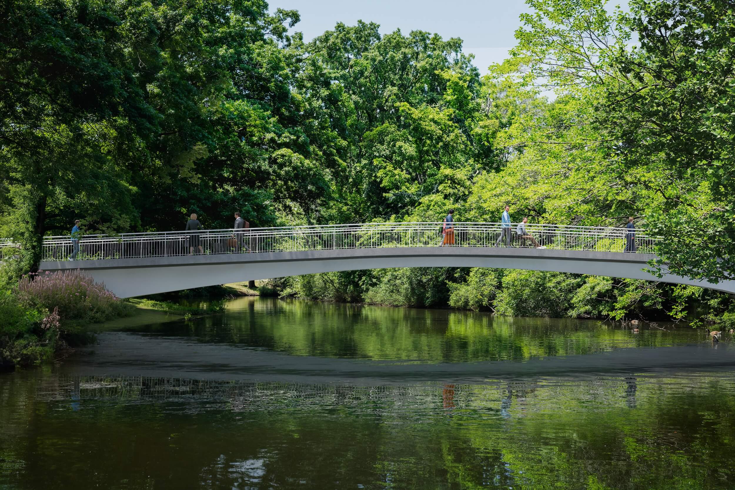 The new Evans Way bridge in Boston’s Back Bay Fens will replace a demolished connection over the Muddy River, restoring a vital link in the park’s historic walkway system. Designed with accessibility and elegance, the bridge will meet ADA accessibility standards. It will feature a steel superstructure and transparent railings inspired by the historic surroundings, blending modern functionality with a nod to the past. The inclined abutments enhance its structural integrity and aesthetic appeal, seamlessly integrating with the park’s natural landscape. Its width will allow pedestrian traffic in both directions, ensuring safe and efficient movement. The bridge will connect the park to cultural landmarks like the Museum of Fine Arts, the Isabella Stewart Gardner Museum, and the Massachusetts College of Art and Design, fostering connections between nature, art, and education. The bridge will restore a historic connection and stand out as a vital pedestrian bridge, offering both functionality and beauty to all users.